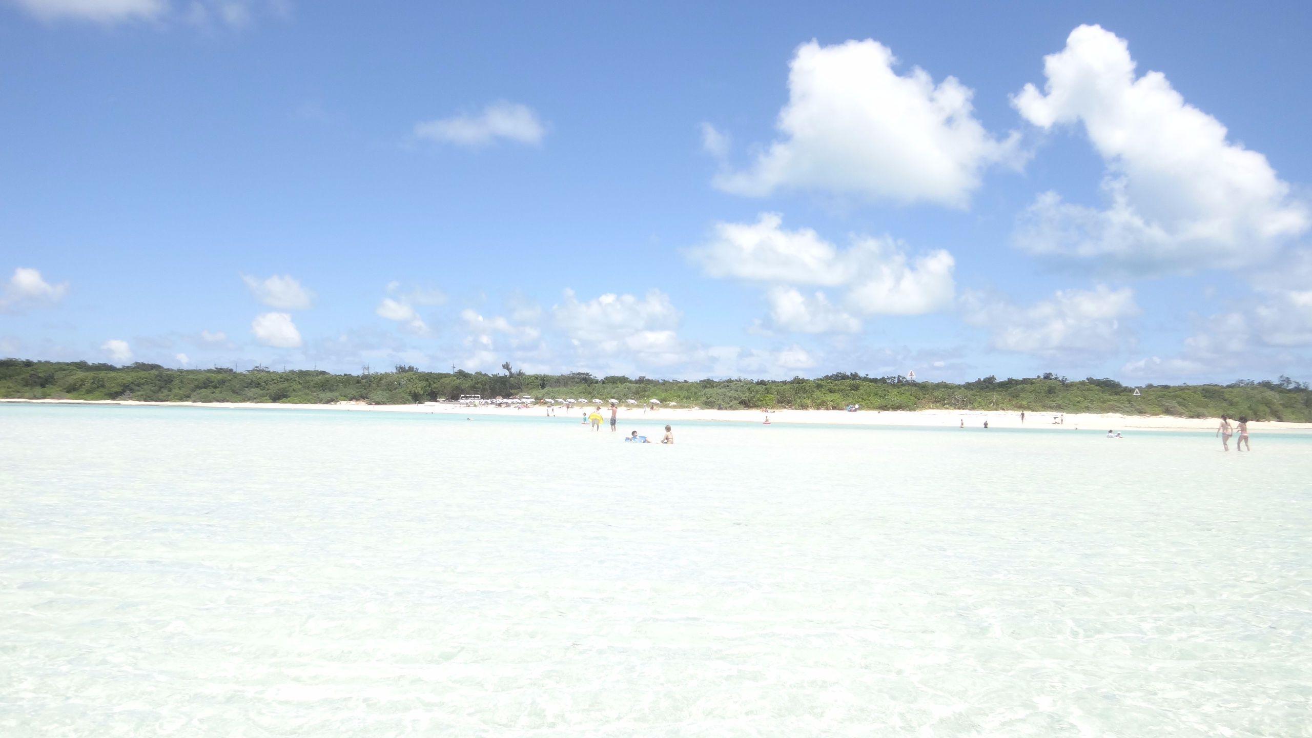 Сам же пляж… небольшая полоска белого песка, с кусками кораллов у кромки воды, так что рифовые тапочки или сланцы не роскошь, а необходимость. Пара рядов зонтиков и огромный залив с нереально чистой мелкой бирюзовой водой… Местные советуют приезжать на этот пляж рано утром, либо поздно вечером. И я таки поняла почему. С приближением полудня, из-за отлива вода сильно мелеет, и пляж, огромный пляж превращается в залив для детей, где и курице по колено. Завораживает вид бродящих по воде аки посуху людей вдали от берега. Для фанатов рыбок, если прогуляться, есть небольшая полоска рифов. Туристы стайками ходят по белоснежным отмелям в поисках идеального места для фото, а самые ленивые, типа меня (подустала от тотального релакса и впечатлений за уже почти 2 недели на островах Окинавы), уподобляются тюленям… отойдя немного от берега, ложатся в мелкую воду и релаксируют. Все не так жарко, как на берегу. Правда есть и опасность — уснуть, особенно если как у меня есть привычка спать на пляжах, за что в очередной раз поплатилась ровным красным цветом кожи через пару часов (хотя после пары недель на Окинаве уже приобрела приличный загар), а проснулась от того, что в конец оборзевшая, по другому и не скажешь, на мелководье рыба цапнула меня за палец на ноге…